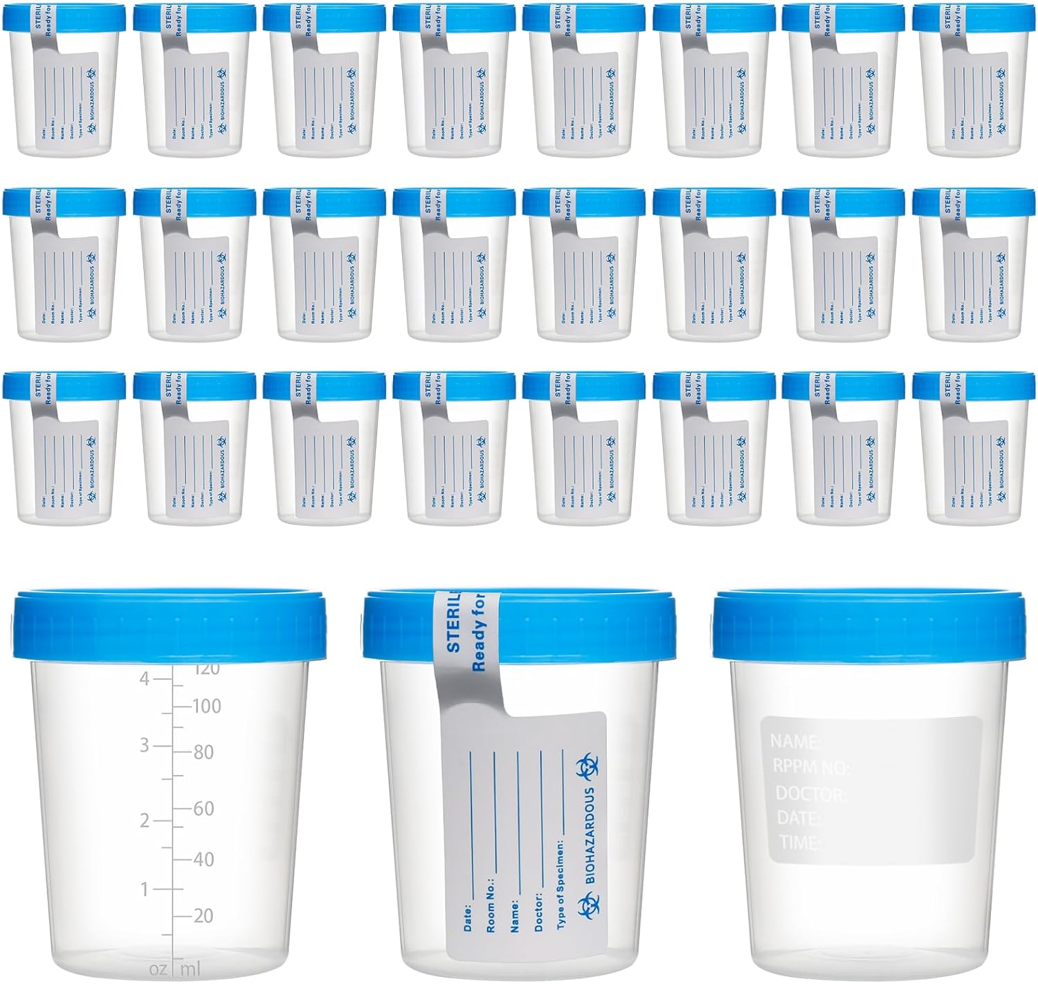 Features: 120 pack 4 oz disposable specimen cups with leakproof screw lids and writable labels (for names, doctor info or room numbers), blue lids for identification, durable plastic construction to prevent spills, compatible with urine fecal testing and multi-scene use. Easy to use: Ready to use with no assembly, tight sealing screw lids for easy closing, lightweight design for carrying and storage, disposable build to reduce cleanup time, labeled surface to avoid mix ups. Specifications: Quantity: 120 pack; Capacity: 4 oz (120 mL); Material: Disposable plastic; Lid Type: Leakproof screw lid; Label: Writable surface for marking. Color: Main cup body: Transparent; Lid: Blue. Package includes: 120 x Disposable specimen cups (4 oz), 120 x Leakproof blue screw lids (each cup paired with one lid). Notes: Manual measurement, please allow a slight error in size. There may be slight color differences due to different screen displays.