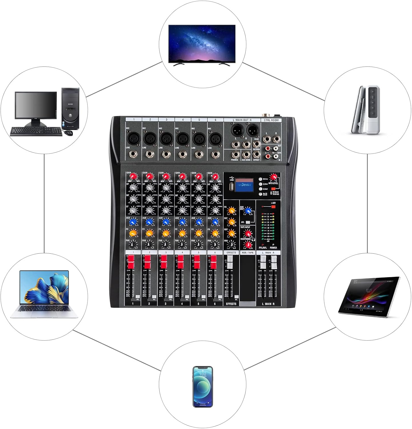 ApplicationThis product can be used for DJ, music studio recording, online karaoke, singing, etc. It is suitable for cell phones, computers, amplifiers, electronic musical instruments, and many other musical devices. SpecificationColor: BlackPlug: US StandardPower Source: Corded Electric Number of Channels: 6Material: MetalVoltage: 110VMicrophone Maximum Input Level: +24dBuMaximum Line Input Level: +24dBuMaximum Output Level: XLR +26dBuMain Level Meter: 10-segment LED, -24dB to CLIPFrequency Response: 20Hz to 30kHz±0.5dBMaximum Power Input Power: 15WTotal at-wave Distortion (THD+N): <0.01% ( Channel Input to Mix Output)Crosstalk (1kHz) : Fader Off >85dB Between Channels >82dBNoise (22Hz to 22KHz) : Equivalent Input Noise -122dBu Residual Output Noise <-90dBuMono/Stereo Channel EQ : High Frequency, Broom, +/-15dB, 12KHzLow Frequency, Broom, +/-15dB, 80KHzHigh and Low Frequency, Peak and Valley, +/-15dB, 2.5KHzMono:XLR Balanced, 2-pin Hot End, 2Kohm Sensitivity -60 to +14dBuTRS Balanced, Tip Hot End 10Kohm Sensitivity -40 to +14dBuXLR Phantom Power +48V2-track Return: RCA Lotus Mount, Unbalanced, 4K ohm,2 dBu2-track Transfer: RCA Lotus, Unbalanced, <75 ohm,-2 dBuL/R Output: XLR, Balanced, Tip Hot End, <75 ohm, +4dBu,+22dBu maxFX/AUX Output: TRS, Unbalanced, Hot Tip, <75 ohm, -2dBu, +18dBu maxHeadphones: TRS, Tip L-ring R, 30 to 600 ohm Recommended for HeadphonesStroke Slide Fader Length:6cm/2.36inGross Weight: 4kg/ 8.82lbs Product Size: 34.2*34*3.7cm/ 13.46*13.38*1.46inPackage Size: 37.5*9*42cm/ 14.76*3.54*16.54inPackage Included1 * Audio Mixer1 * Power Co
