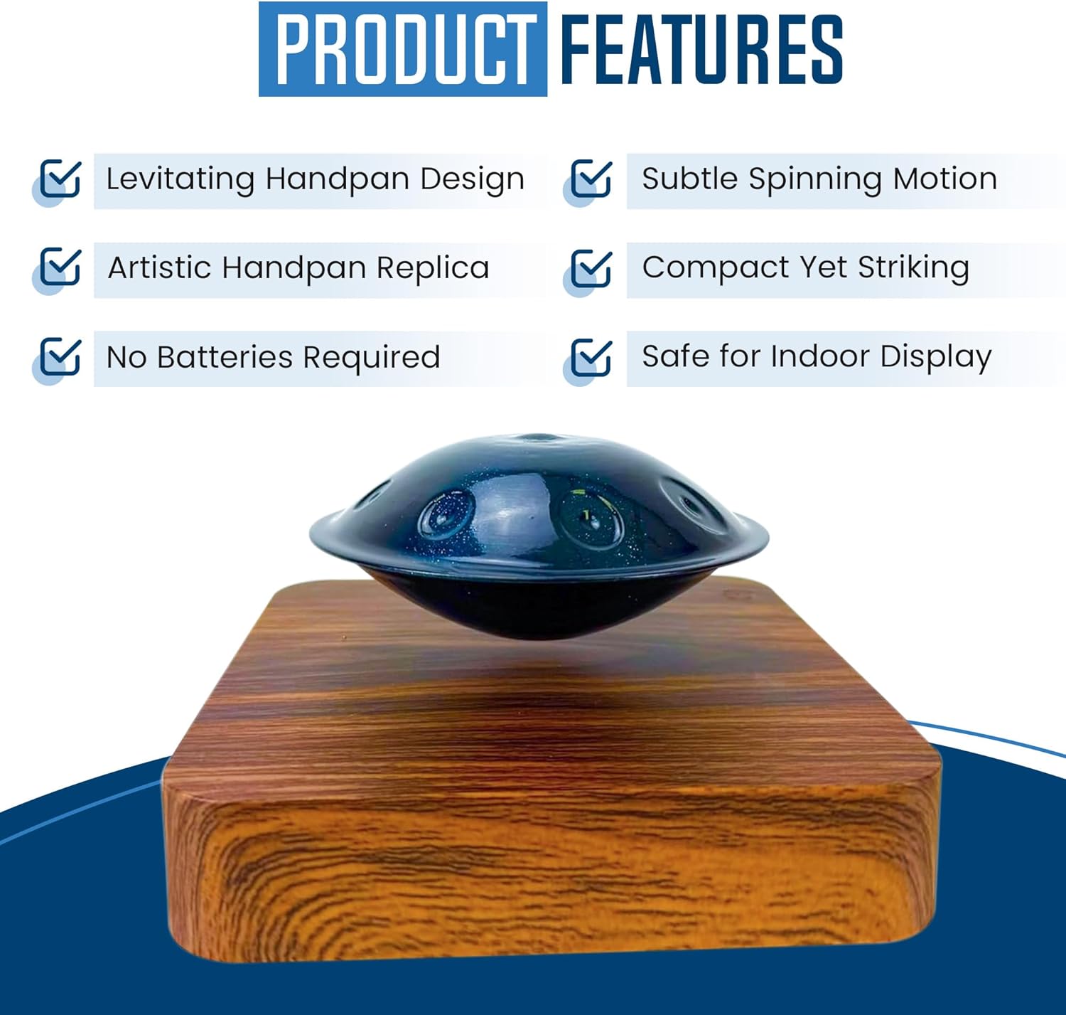 • Mesmerizing Levitating Display – This mini handpan floats effortlessly using advanced magnetic suspension technology, creating a captivating visual effect perfect for relaxation and inspiration.