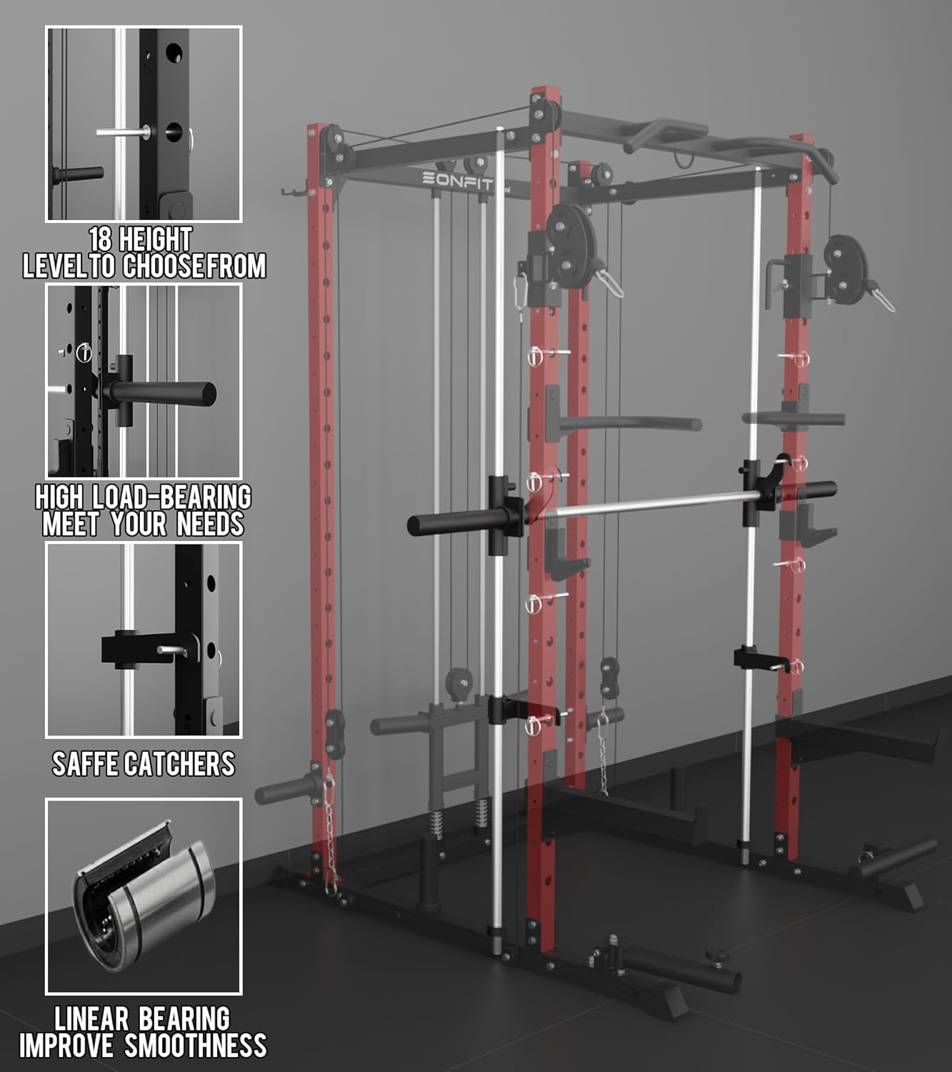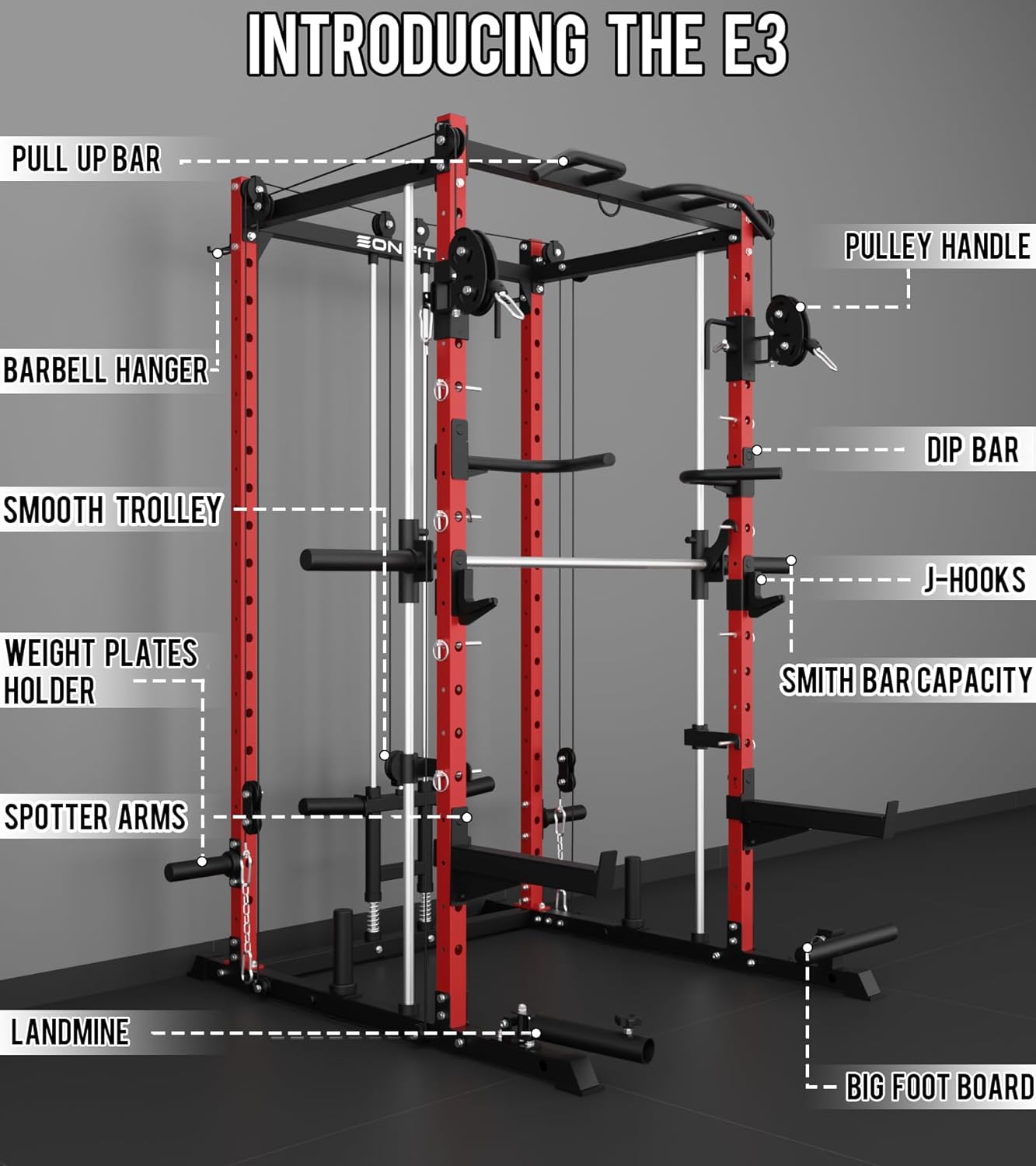 | Included Components | standard J-hooks, multi pull up bar, safety arms, dip bar, barbell hanger, weight plates horns, landmine, row feet tube, two hand straps, lat bar, and straight bar |