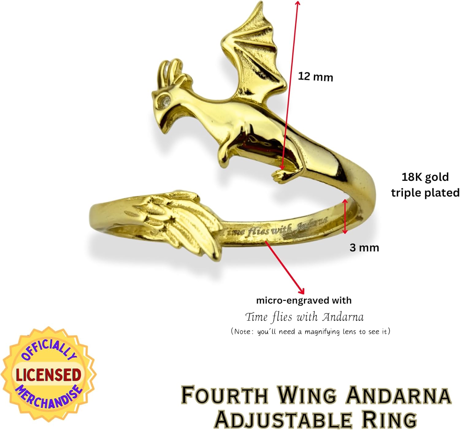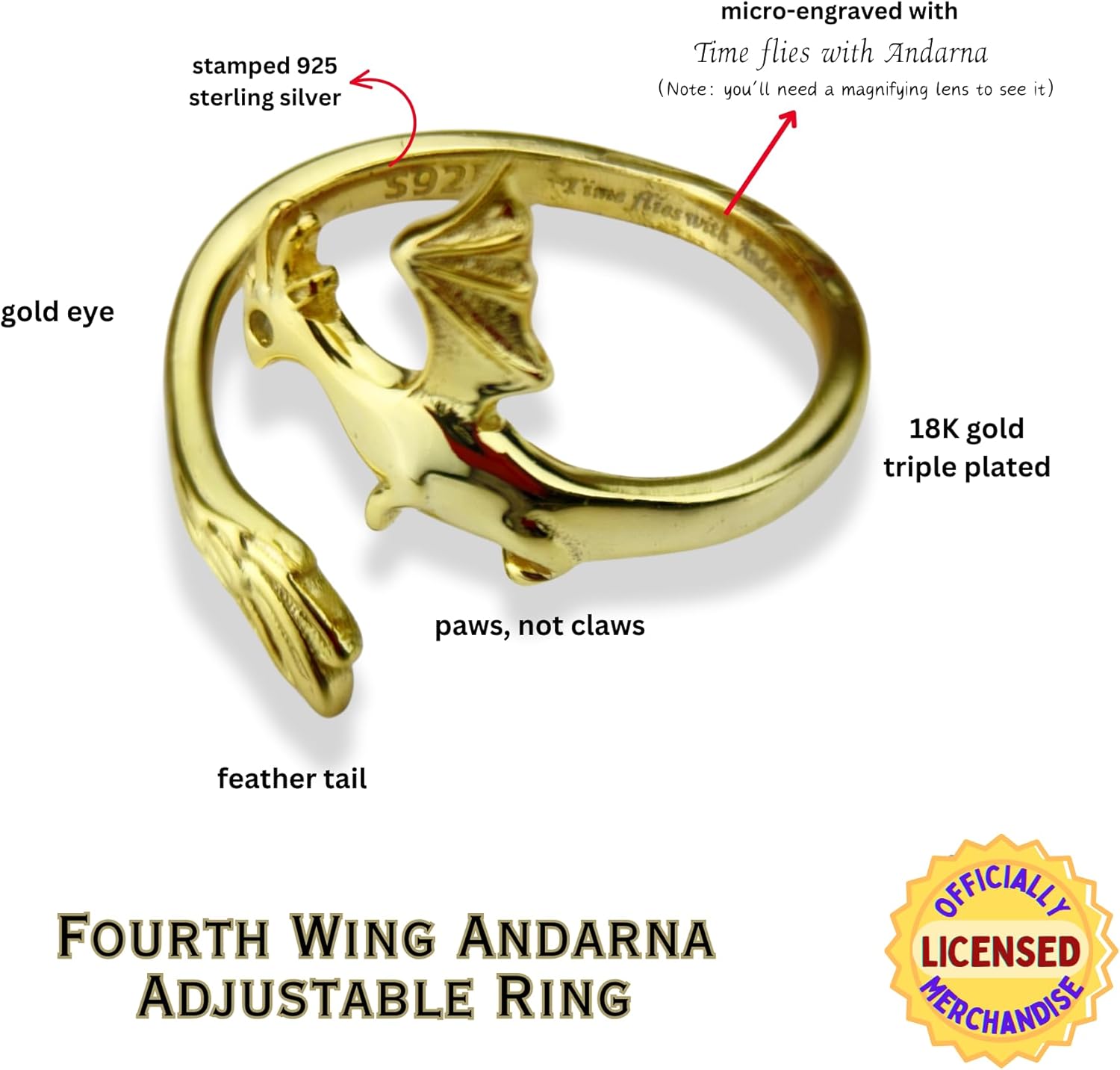 ๐ข๐๐๐๐๐๐๐๐๐ฌ ๐๐๐๐๐ก๐ฆ๐๐ ๐ ๐๐ฅ๐๐๐๐ก๐๐๐ฆ๐ Artwork/Photography inspired by the book FOURTH WING by Rebecca Yarros, published by Red Tower Books, an imprint of Entangled Publishing, LLC. Copyright 2023 by Rebecca Yarros. Artwork/Photography by The Literary Charm. Slip on this gorgeous ๐๐ป๐ฑ๐ฎ๐ฟ๐ป๐ฎ ๐๐ผ๐น๐ฑ๐ฒ๐ป ๐๐ฒ๐ฎ๐๐ต๐ฒ๐ฟ๐๐ฎ๐ถ๐น ๐๐ฟ๐ฎ๐ด๐ผ๐ป ๐ฅ๐ถ๐ป๐ด on your finger! One of ๐ฉ๐ถ๐ผ๐น๐ฒ๐ ๐ฆ๐ผ๐ฟ๐ฟ๐ฒ๐ป๐ด๐ฎ๐ถ๐นโs bonded dragons at ๐๐ฎ๐๐ด๐ถ๐ฎ๐๐ต ๐ช๐ฎ๐ฟ ๐๐ผ๐น๐น๐ฒ๐ด๐ฒ, Andarna is a juvenile with the power to manipulate time. To this end, the ring comes micro-engraved with the saying, โ๐๐ช๐ฎ๐ฆ ๐ง๐ญ๐ช๐ฆ๐ด ๐ธ๐ช๐ต๐ฉ ๐๐ฏ๐ฅ๐ข๐ณ๐ฏ๐ขโ. Together with ๐ง๐ฎ๐ถ๐ฟ๐ป, Andarna helps Violet survive to become a dragon rider. Firm but malleable, this beautiful dragon wing circlet comfortably adjusts to your finger. Detailed wing & feather etching is visible around the surface. Triple-plated in 18K gold over Sterling silver (S925), you can restore its brilliance with a few swipes of a microfiber cloth. Best, it comes ready for gifting in our kraft packaging. ๐๐๐ฆ๐๐๐๐๐ ๐๐ฅ I affirm that the artwork/photography featured on the products available for purchase is entirely my own original creation. Rebecca Yarros and Red Tower Books/Entangled Publishing have provided their approval for the use of this artwork, but please note that they have not directly collaborated with me in the artistic process. Additionally, any character traits depicted in the artwork are purely the result of my imagination and have no connection to any future characters in books by Rebecca Yarros, as I possess no foreknowledge of such traits. ***แดสษช๊ฑ ษช๊ฑ สษช๊ฑแดแดแด แด๊ฑ แด แดแดแดกแดสสส ษชแดแดแด & ษช๊ฑ สแด๊ฑแดแด แดษด แดแดส แดสษชษขษชษดแดส แด แด๊ฑษชษขษด แดสแดแดแดแดแด แดกษชแดส แดแดส แดสแดแด แดแดแดษชแดษด แดแดสแดษดแดส(๊ฑ). ***