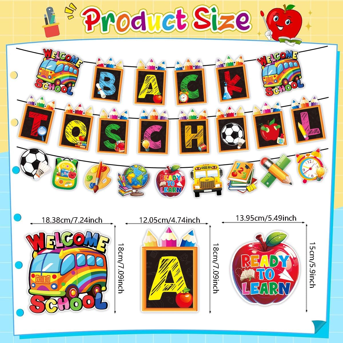 Transform your learning space into a festive celebration with this comprehensive Back to School decoration set! The centerpiece is a vibrant 'BACK TO SCHOOL' banner featuring chalkboard-style letters with playful pencil accents, measuring 7.24 inches tall. The set includes charming educational cutouts of school buses, globes, apples, and learning symbols, plus matching cupcake toppers for a complete celebration. Each decorative piece measures 5.49 inches, while individual letter cards span 4.74 inches, ensuring clear visibility across any room. The package includes festive balloons in red, yellow, and blue with school-themed prints, creating an engaging atmosphere. All pieces come with pre-attached strings for effortless setup, making it perfect for classroom walls, doorways, or bulletin boards. This 24-piece collection includes everything needed to create an exciting welcome display that gets students energized for the new school year. Ideal for first-day celebrations, classroom decoration, or school entrance displays, this decoration kit helps create memorable moments for teachers and students alike. The complete set features durable materials and comes with balloon ribbons for professional-looking arrangements.