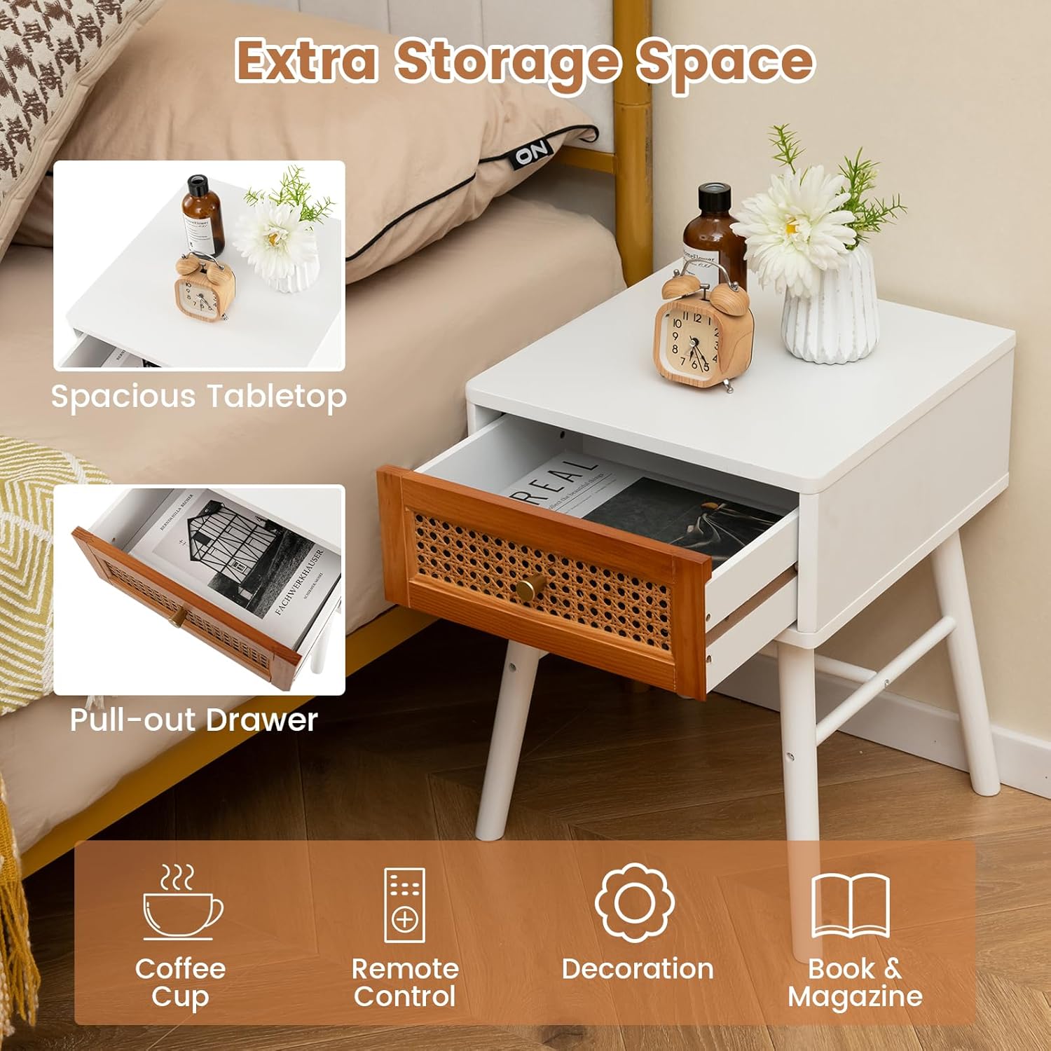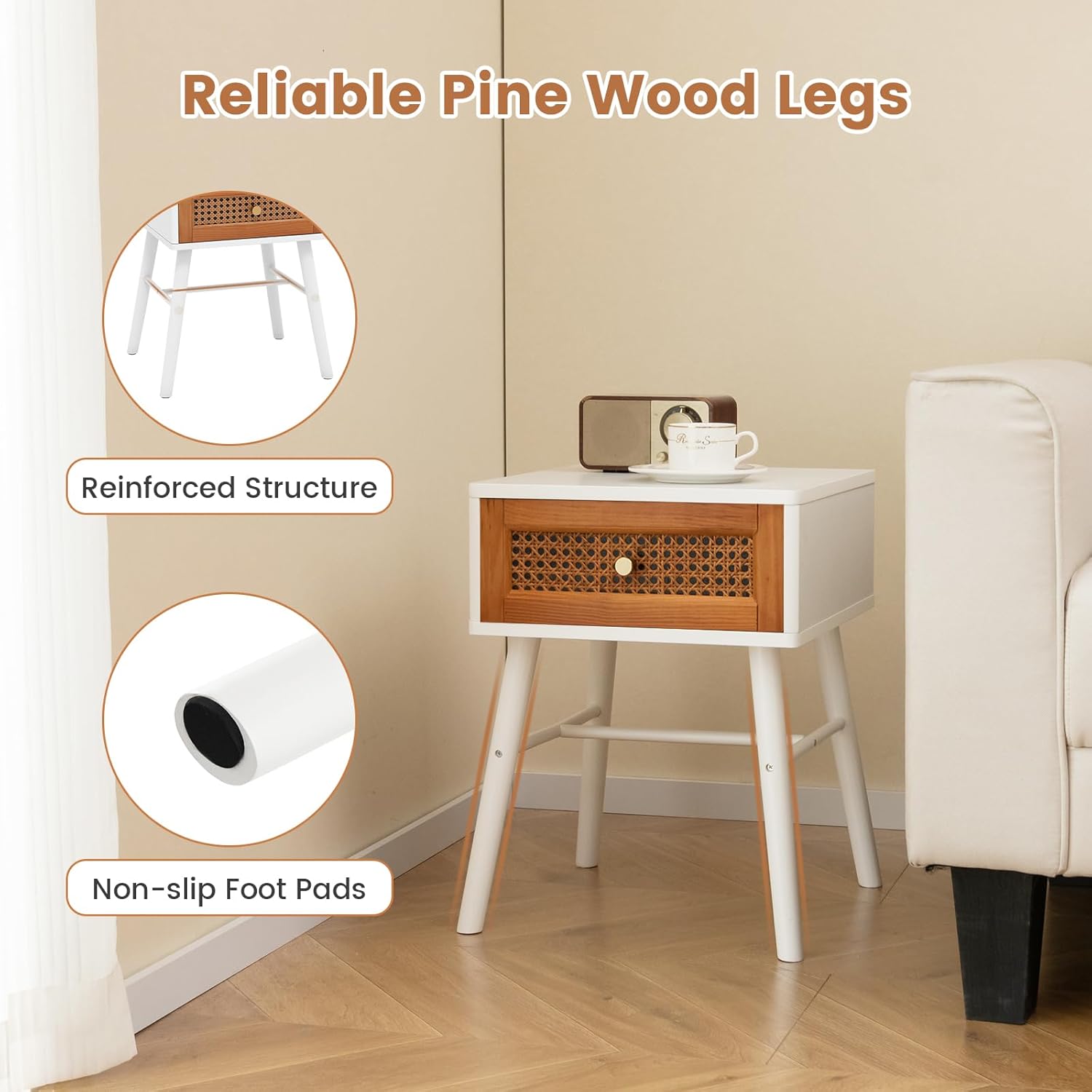 Description:Experience the perfect combination of rustic charm and modern sophistication with our natural rattan nightstand. Crafted with high-quality MDF and solid pine wood, this nightstand boasts a sturdy structure that is built to last. The spacious tabletop provides ample space for your daily essentials, while the convenient drawer offers storage for additional items. Versatile in design, this mid-century modern end table can be used as a coffee table, accent table or nightstand, effortlessly elevating the look of any room. Assembly is a breeze with clear instruction, and maintenance is simple thanks to the sleek painted surface. Embrace elegance and functionality with this stylish and durable nightstand.Features:Natural rattan decor for a touch of rustic eleganceSimple lines and delicate details for a sophisticated lookWide tabletop for lamps and decorative itemsConvenient drawer for night-time essentialsMade of high-quality MDF and solid pine wood for durabilitySturdy structure with solid wood legs and non-slip padsMid-century modern design suits for various scenariosSuitable as a coffee table, end table or nightstandEasy assembly with clear instruction and accessoriesLow maintenance with a sleek painted surfaceSpecifications:Color: White + BrownMaterial: MDF, Pine Wood, RattanOverall Dimensions: 15.5” x 15” x 19.5” (L x W x H)Interior of Drawer: 12.5” x 11” x 3.5” (L x W x H)Weight Capacity of Tabletop: 110 lbsWeight Capacity of Drawer: 22 lbsNet Weight: 28 lbsPackage Includes:2 x Nightstand1 x Instruction