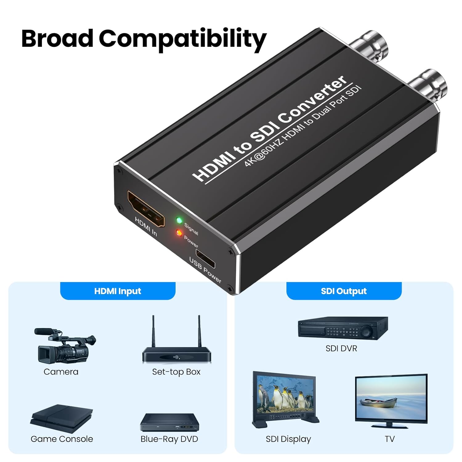 This HDMI to SDI converter is tailor-made to transform HDMI signals into broadcast-grade 3G-SDI/HD-SDI signals, equipped with auto format detection and audio embedding features—ideal for professionals in broadcasting, live events, or video production who need seamless signal bridging. As a dedicated HDMI to SDI device, it prioritizes both image quality and transmission stability, making it a reliable choice for various AV setups. Important Notes 1.This device works exclusively as an HDMI to SDI converter; it cannot be reversed to convert SDI to HDMI. 2.The HDMI to SDI adapter only supports SDI signal coaxial cables. It is not compatible with RF, CVBS, AHD, TVI, or CVI signals. 3.While it accepts HDMI input up to 4K@60Hz, the converter does not decode HDCP 2.2—verify your source content’s compatibility if HDCP is involved. Detailed Specifications: 1.Input Connector: 1 x HDMI Type A (for HDMI signal input) 2.Output Connectors: 2 x Male BNC (supports only SDI signals) 3.HDMI Input Resolutions: 480i@60Hz, 576i@50Hz, 480P@60Hz, 576P@60Hz, 720P@50/60Hz, 1080p@24/25/30/50/60Hz, 800x600P@60Hz, 1024x768P@60Hz, 1280x800P@60Hz, 1280x960P@60Hz, 1360x768P@60Hz, 1400x1050P@60Hz, 1440x900P@60Hz, 1600x1200P@60Hz, 1680x1050P@60Hz, 3840x2160@24/25/30/50/60Hz, 4096x2160@24/25/30/50/60Hz 4.SDI Output Resolutions: 720P@50/60Hz, 1080P@24/25/30/50/60Hz (compatible with HD-SDI/3G-SDI) 5.SDI Data Rates: 270Mb/s, 1.485Gbps, 2.97Gbps What You Get 1 x 4K-Capable HDMI to SDI Converter 1 x Power Plug 1 x Power Cable 1 x User Instruction Manual