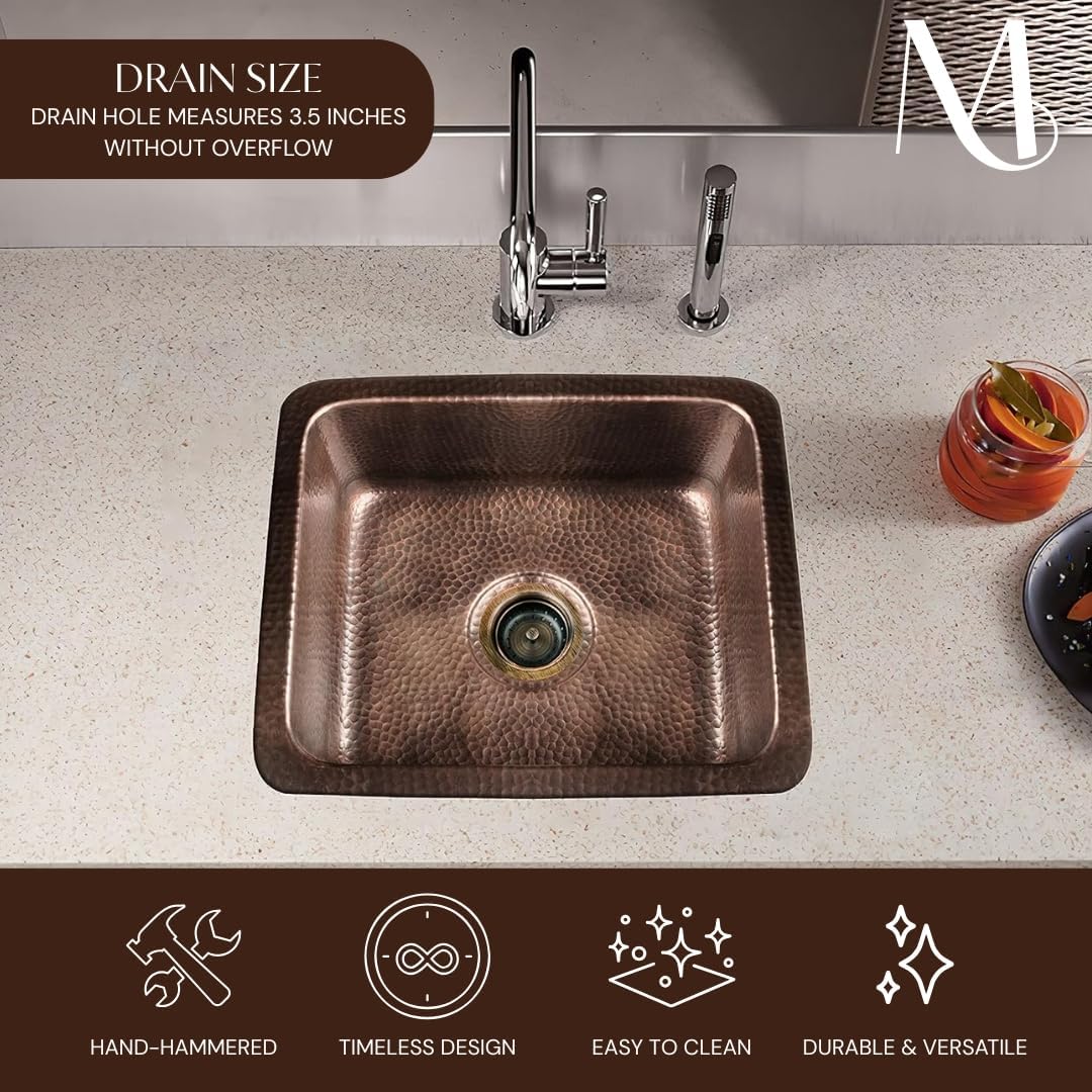 Elevate your kitchen or bar with the timeless elegance and artisan craftsmanship of the Pure Copper Highball Dual Mount Kitchen & Bar Sinks. Made from pure heavy gauge copper made to last, this sink is a durable and functional statement piece. Each drop in bar sink is individually hand-hammered by skilled artisans, resulting in a unique texture that adds character and warmth to your space.With its rich oil rubbed bronze finish and intricate hand-hammered texture, this dual mount kitchen sink blends visual appeal with rugged functionality. Whether you're creating a rustic, modern, or transitional space, it serves as an elegant and functional decor for your kitchen or bar while standing up to daily use.The dual mount design allows for installation as either a drop in kitchen sink or an undermount kitchen sink, giving you flexibility to match your design needs. It also includes a cutout template for installation, making the process smooth and hassle-free. (Note: Drain and faucet not included.)With outer dimensions of 17.25 x 15.25 x 6.5 inches and inner dimensions of 15 x 13 x 6.5 inches, this single bowl kitchen sink is ideal for wet bars, prep areas, and secondary installations where a small bar sink or small kitchen sink is desired, without sacrificing depth or usability.Perfect for home chefs, entertainers, or anyone wanting to upgrade their wet bar sink, this kitchen drop in sink or undermount model offers lasting performance and sophisticated style. It’s also easy to clean—just wipe it down with a damp cloth to maintain its natural shine.Whether used as a kitchen sink undermount, bar sink, or prep sink, this piece combines form and function beautifully, making it one of the most stylish and reliable kitchen sinks available today.