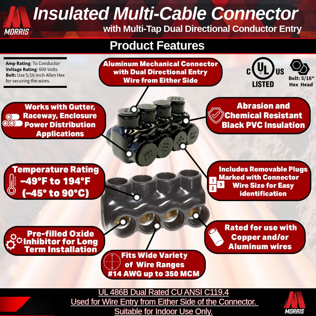 Plugs Marked with Connector Max Wire Size for easy identification. Dual Entry Cable Connector is CU9AL Dual Rated 6061-T6 Aluminum for use with Copper and/or Aluminum wires. One Wire per Terminal. Temperature Range of –49°F to 194°F (–45° to 90°C). ANSI C119.4 & cULus 486b Listed thru 750MCM. Rated 194°F(90°C) 600 Volt.
