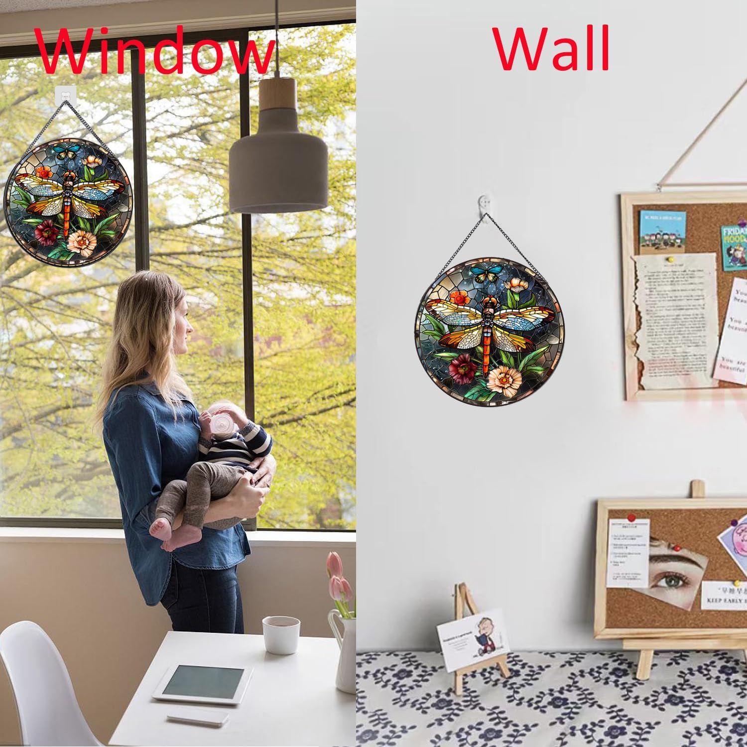 Use this beautiful dragonfly stained glass home decor to welcome the warm spring! Features: Exquisitely Design Attractive and uniquely dragonfly designed with a stained glass style,it is the best choice for home decoration. Hanging with Chain Comes with a metal chain for quick and easy hanging. Perfect Gift Ideas Can be used as Birthday present, Christmas gifts ,Mother's Day gifts, Valentine's Day gifts, Easter gifts, New Year's gift,etc; A special gift for your friends, family, lover, etc. Specifications: Material: glass Size:20*20cm/7.87*7.87inch Weight:350g/0.77lb