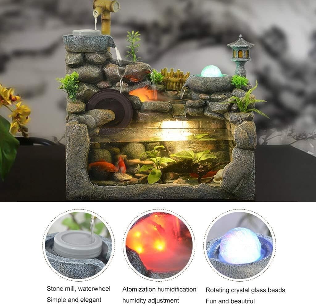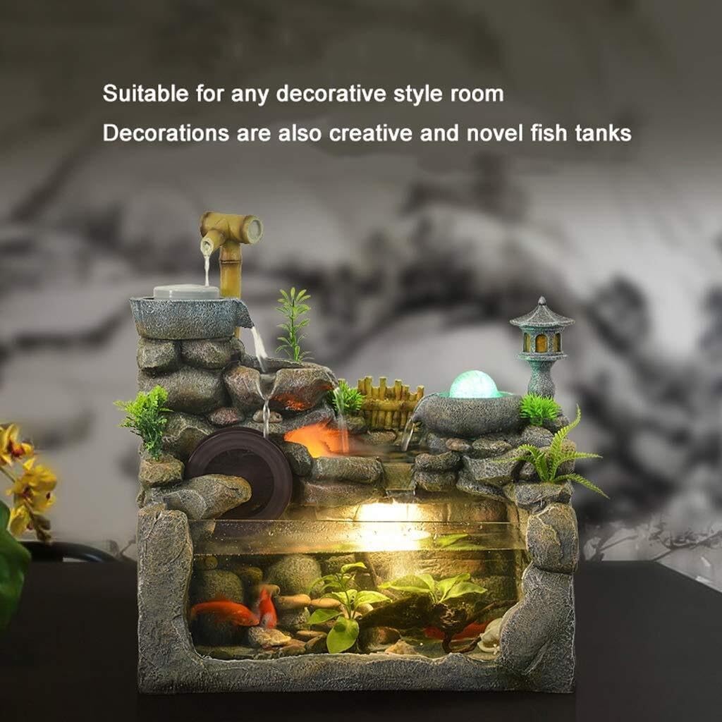Bring tranquility and natural beauty to your living space with the Tabletop Fountain Desktop Water Fountain. This elegant rockery waterfall features a built-in fish tank and cascading water that flows gently, creating a soothing, melodious sound to help you unwind after a busy day. Perfect for enhancing your home decor or office, this fountain adds a calming, natural ambiance to any room.Crafted from synthetic resin, this water fountain mimics the look of rock and water, blending seamlessly into your living room, study, or workplace. The LED lights at the base provide a soft glow, creating a peaceful setting while illuminating the fish tank (fish not included). You can even add small plants or fish for a more personalized touch.Ideal for humidification, the gentle flow of water increases indoor humidity, making the air feel fresher and healthier. Whether used as a decorative accent or a functional piece to improve air , this fountain is a perfect addition to any space.Key Features:Material: synthetic resin that replicates natural rockLED Lighting: Soft, calming illumination for added ambianceHumidification: Increases air moisture to create a healthier environmentFish Tank: Add small fish for a lively touch (fish not included)Dimensions: Perfect for desktop, living room, office, and morePerfect for: Living rooms, offices, study rooms, hotels, and clubs.