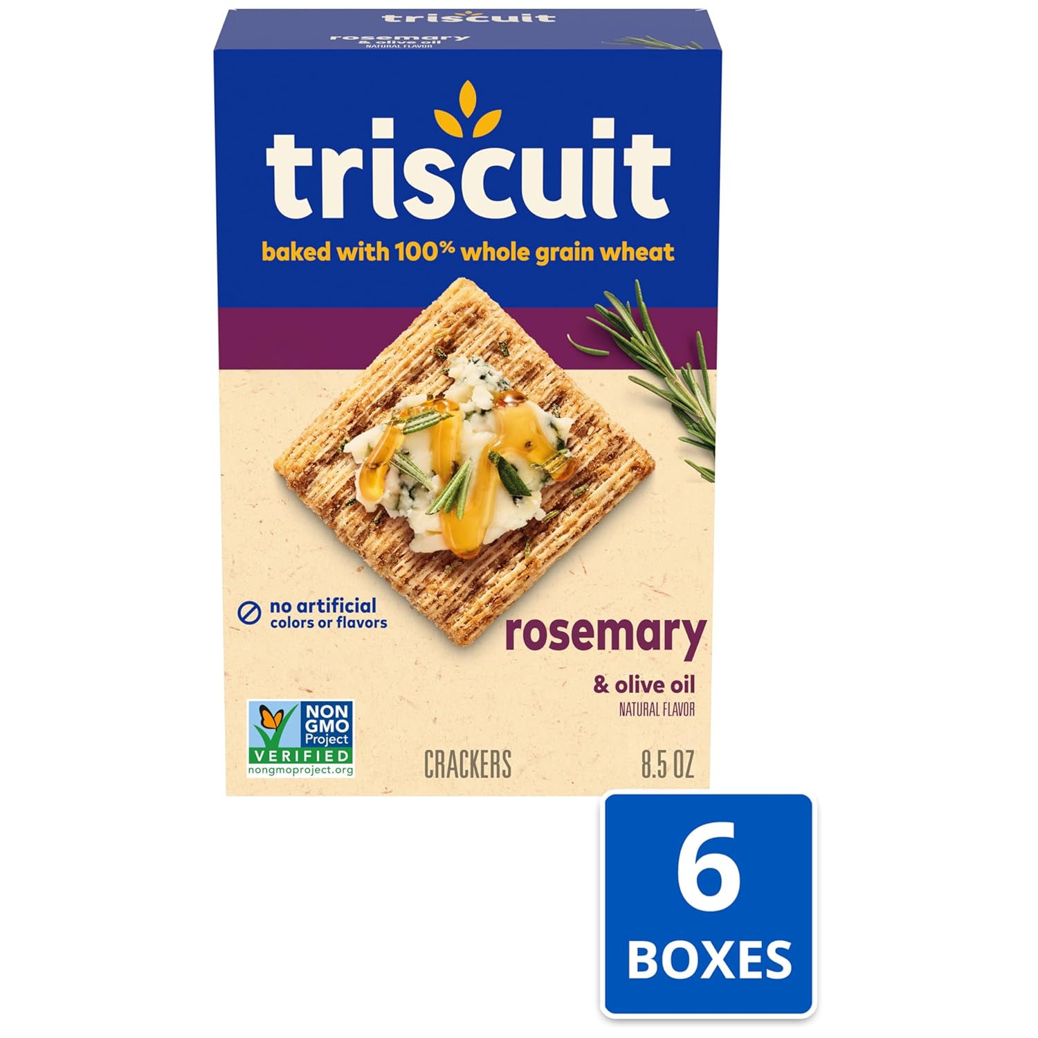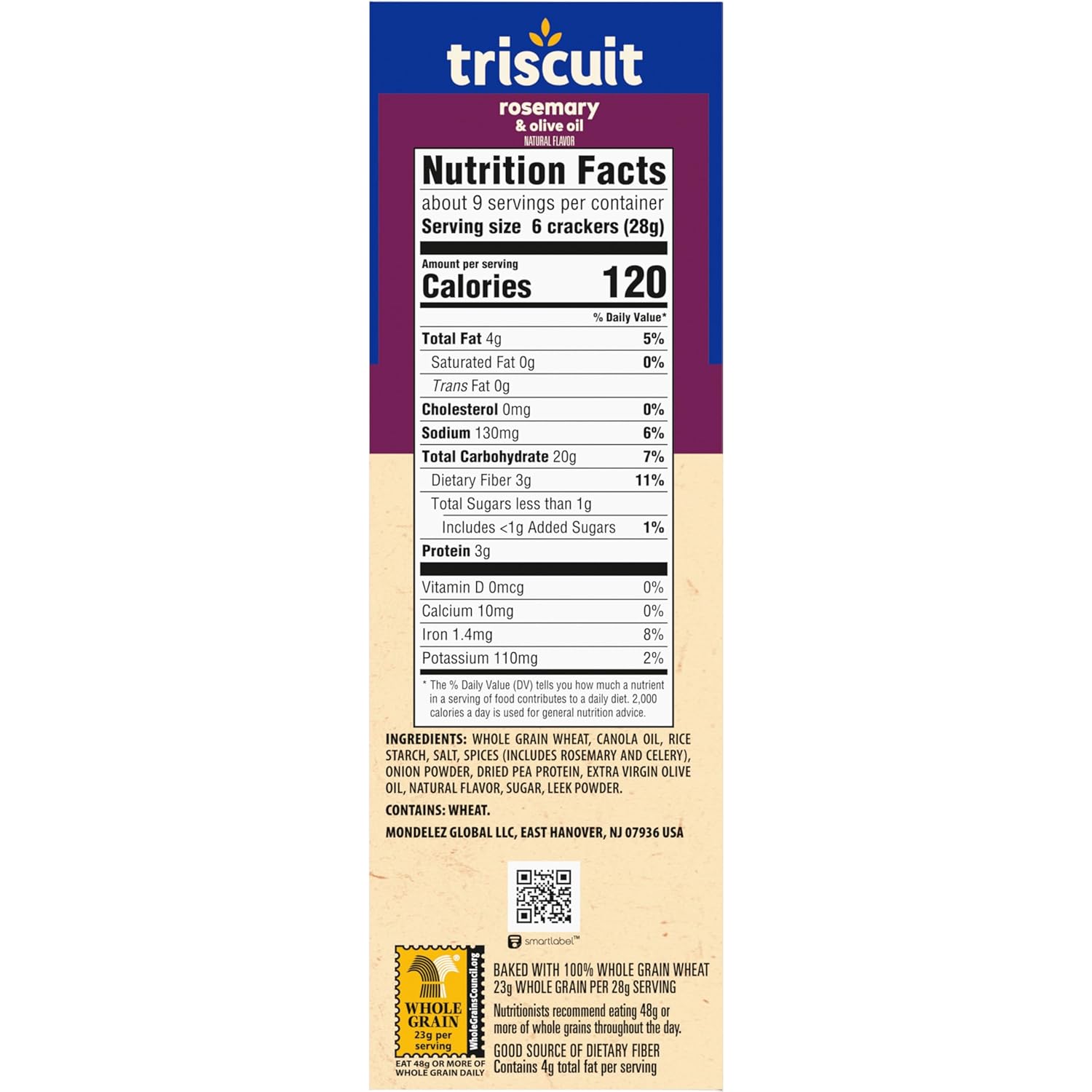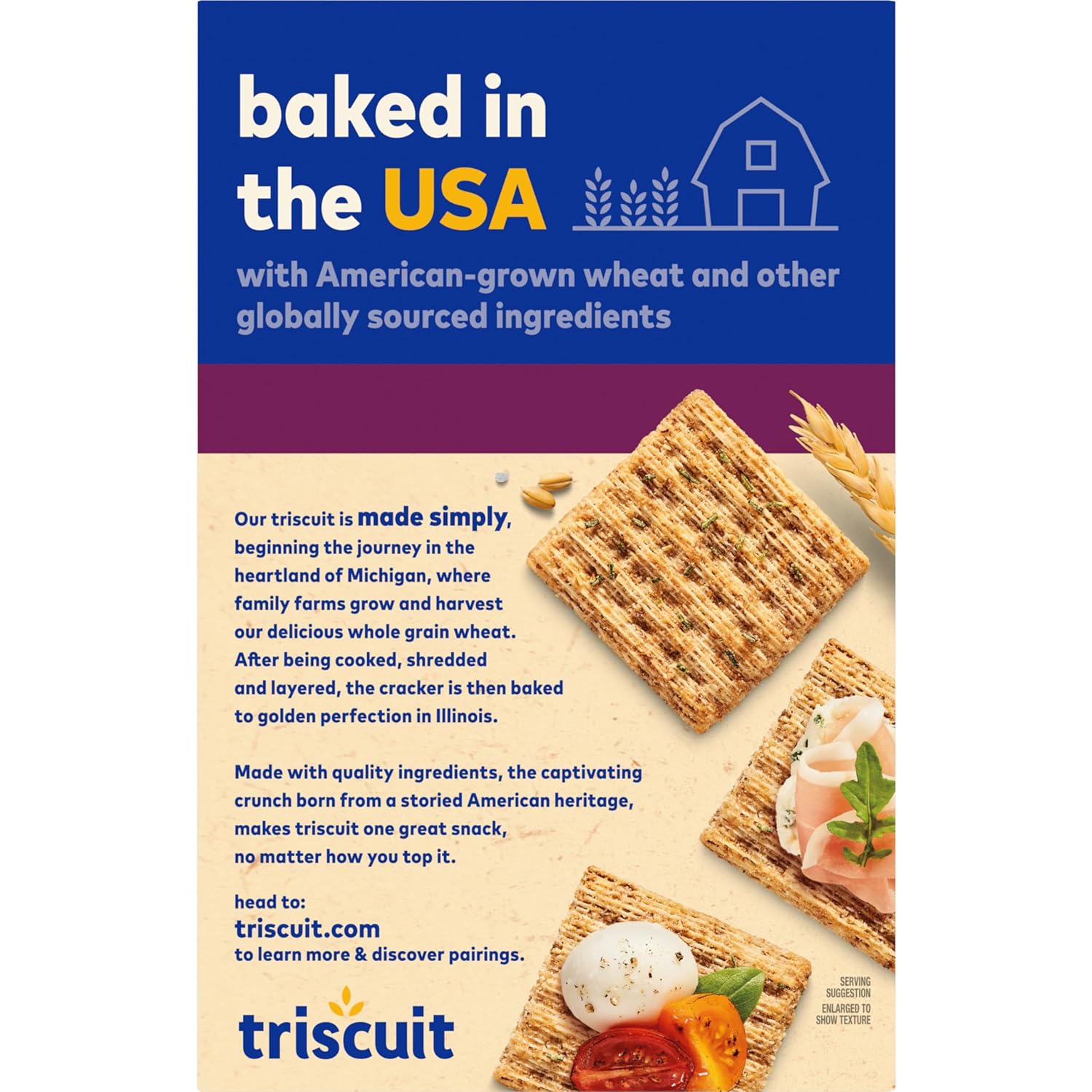 Triscuit Rosemary & Olive Oil Whole Grain Wheat Crackers are made simply with quality ingredients. Baked to perfection, these snack crackers use 100% whole grain wheat proudly grown in the USA and sunflower oil. The square snack crackers are made with their signature woven texture for a satisfying crunch. Rosemary & Olive Oil Triscuit crackers are Non-GMO Project Verified, made without artificial colors or flavors and a good source of dietary fiber (see nutritional information for fat content) for delicious wholesome goodness. Enjoy the crunch of these delicious rosemary crackers on their own, or top with your favorite cheese, fruit, or flavorful spreads. Triscuit cracker snacks cover all of your snacking needs, whether you need lunch snacks for kids, snacks for adults or on the go snacks for traveling. Serve these bulk crackers at parties by creating a delicious charcuterie board featuring Triscuit crackers alongside your favorite cheese, meat, fruit, and vegetables for an easy appetizer.