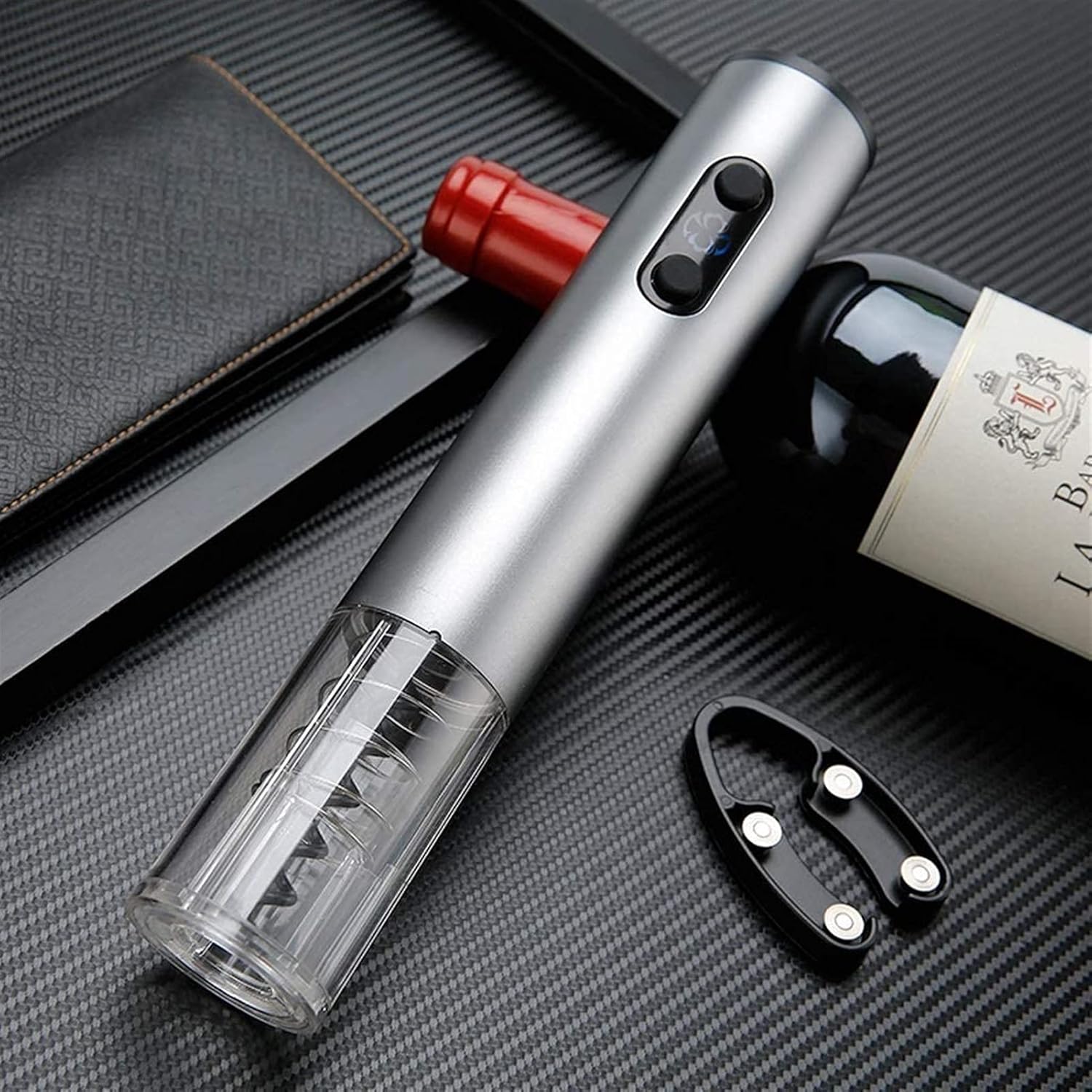 Open the encounter with fine wine Name: Electric bottle opener Color: silver gray Material: aluminum alloy Power: 4 batteries (without battery) Uses: electric bottle opener Size: height 25 cm wide 4.5 cm Products include: 1* Wine Opener If you have any doubts about the product, please send us an email, we will give you a satisfactory reply as soon as possible.